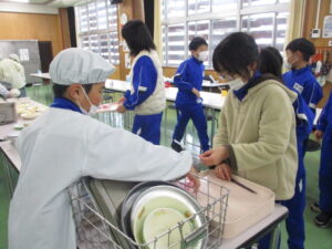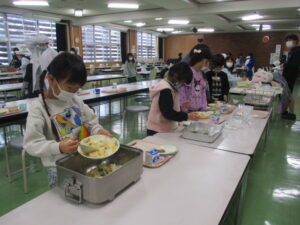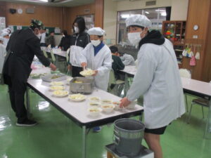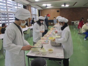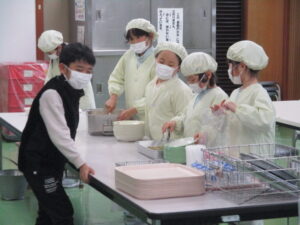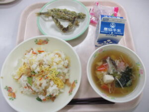 本日の給食は、錦糸卵入りちらし寿司、すまし汁、子持ちシシャモの磯部天ぷら、牛乳、ミニ桜餅です。3月3日の今日は、「ひな祭り」です。ひな祭りは、女の子の成長を祝う行事で、おひなさまの人形を飾ったりします。今日の給食では、お祝いの気持ちを表す「ちらし寿司」です。春らしい彩りも目で見て楽しみましょう。そして、デザートには「桜もち」をつけました。