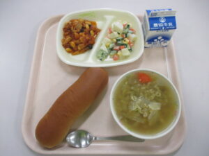 本日の給食は、黒糖コッペパン、ABCスープ、豆とチキンのトマト煮、マセドアンサラダ、牛乳です。今日の工夫は、豆とチキンのトマト煮の「大豆」です。給食では、できる限り「乾燥大豆」を使うようにしています。その理由は、「かたさ」を調整できて、おいしいからです。調理員さんの加減で、ほどよい硬さに茹でました。