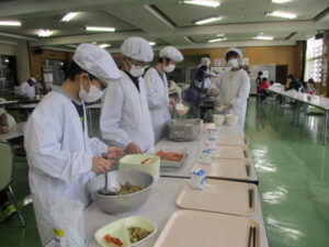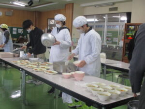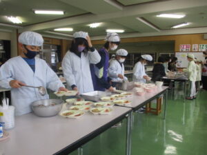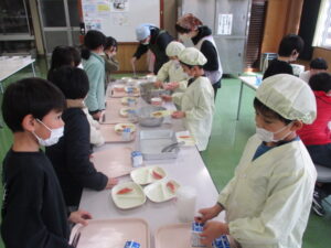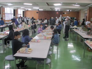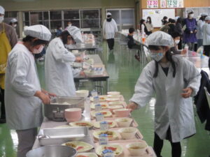 本日の給食は、ご飯、すいとん、金目鯛の塩焼き、刻み昆布の炒め煮、牛乳です。今日は、15年前に東日本大震災があった日です。給食では、備蓄しておくとよい乾物を取り入れた「刻み昆布の炒め煮」と、簡単に作れて、栄養満点な「すいとん」にしました。地震などの災害は、いつ起こるかわからない怖さがありますよね。できる準備を日ごろからしていきましょう。そして、今日のメインは、「金目鯛」です。金目鯛は、金色に輝く目を持っていることからその呼び名になりました。皮の下の部分の脂乗りがよく、うま味が特に味わえます。