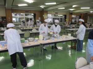 本日の給食は、うずら卵入り中華丼、コクうま中華みそスープ、本さわらのみそ焼き、のりマヨサラダ、型抜きレアチーズイチゴ味、牛乳です。突然ですが、問題です。今日使っていた野菜は何種類でしょう?・・・正解は、13種類です。量もたくさん使っていて、今日の給食を食べると、150g~200gの野菜を食べることができます。野菜の甘さや食感を味わってほしいです。