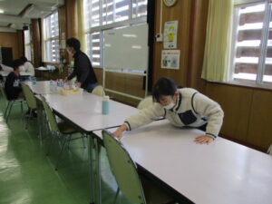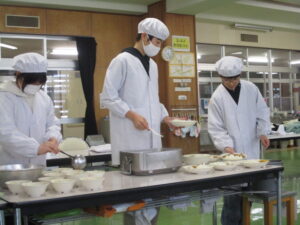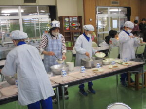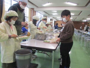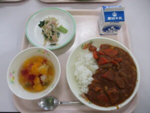 本日の給食は、青大豆入りポークカレー、フルーツポンチ、しょうゆフレンチ、牛乳です。今日のカレーには、青大豆が入っています。グリーンピースとはちがい、大豆の仲間なので、大豆に近い味がします。今日も調理員さんの絶妙な「ゆで加減」で、豆本来のおいしさが味わえると思います。カレーは飲み物といわれるほど、あまり噛みませんが、今日は豆と一緒によくかんで味わって食べましょう。