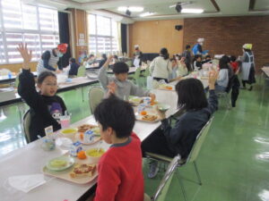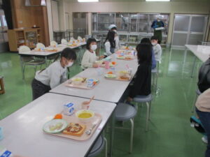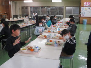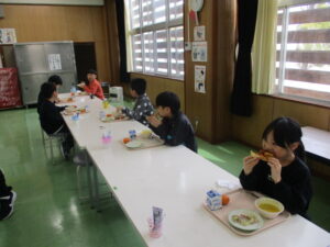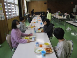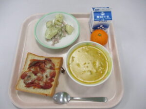 本日の給食は、ピザトースト、パンプキンポタージュ、ジャガベーサラダ、みかん、牛乳です。今日は、給食センターのチャレンジメニューです。ピザトーストは、まず具材を炒めてトマトソースを作りました。そして、そのソースを食パンにぬり、チーズをかけて焼きました。バジルが入っているので、少しオシャレな味になっています。