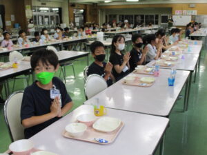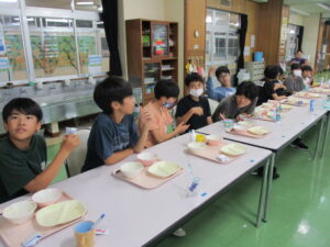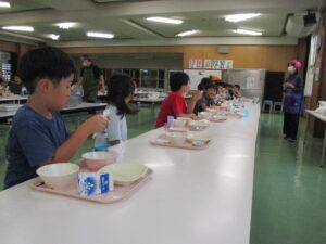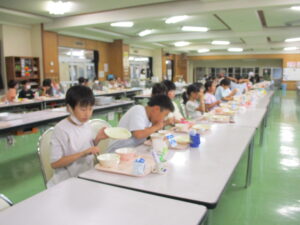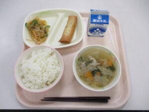 本日の給食は、ごはん、白菜うま塩スープ、春巻き、糸うりの中華サラダ、牛乳です。