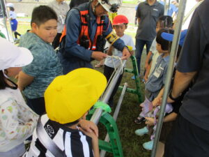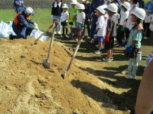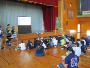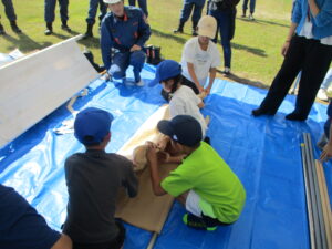 消防団による放水訓練に始まり、学年ごとに3つの防災授業を行いました。土のう、簡易担架作成や縄結び、様々な展示や体験、防災講習などを通して、災害に向けた備えや災害時の行動についての理解を深めることができました。当日は、多くの方々から運営に携わっていただきました。また、来賓、地域の方々、保護者の方々から参加いただきました。貴重な経験ができ良かったです。
