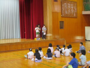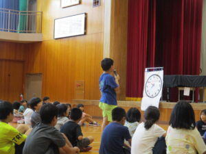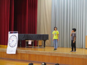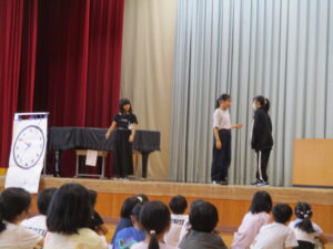 須原小学校では、20分休み、昼休みの終わる5分前に放送委員会が放送を入れてくれています。「自分で時計を見て行動できるように」という願いを込めて、放送委員会が「ノー放送デー」を企画してくれました。今日の児童集会では、劇を交えてより良い行動の仕方を見せてくれました。その後は、各教室でどんなことに気を付けたら良いかを話し合いました。ノー放送デーは、10月1日から開始です。子どもたちがどんな行動をするのか期待しています。