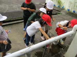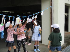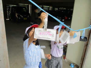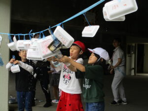 ペットボトルを使った的あて遊びを楽しんでいた1年生です。こども園のお友達も招待して一緒に遊ぶ予定とのことでした。仲良く、楽しく遊ぶことができると良いなと思います。