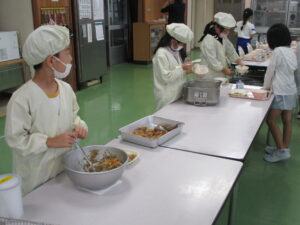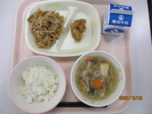 本日の給食は、ごはん、塩ちゃんこスープ、鶏肉のレモン和え、切り干し大根の焼きそば風炒め、牛乳です。