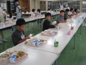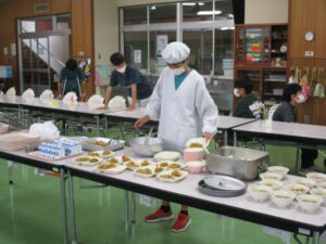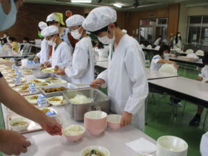 今日の「鶏肉のレモン和え」は、燕市から持ってきたレシピです。甘じょっぱいタレですが、レモン果汁の酸味で、最後までさっぱりおいしく食べられます。塩ちゃんこスープは、削り節の出汁、鶏と豚のガラスープ、干しシイタケの戻し汁を使うなど、うま味たっぷりのスープになっています。うま味は、様々な種類のうま味をかけ合わせることで、相乗効果がうまれるため、うま味が倍増します。今日のスープの味から存分にうま味を感じましょう。