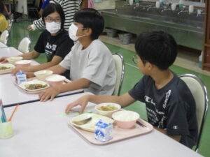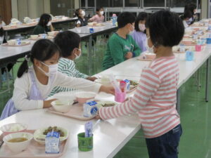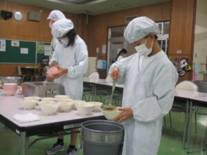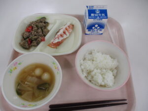 本日の給食は、ごはん、白玉汁、鮭の塩焼き、なすみそ、牛乳です。「なすみそ」は、魚沼地区でよく食べられている料理です。みなさんもお家でよく出てくるメニューのひとつなのではないでしょうか?ですが、周りで聞くところによると、子どもよりも大人が好きなメニューで、若い人はあまり食べないという話もありました。今日のなすみそは、豚挽き肉をたっぷり使い、甘めに仕上げているので、若い人でも食べやすい味付けになっていると思います。