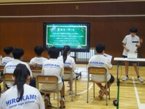 2年生が7月に実施した職場体験学習のまとめの発表会を来週実施します。27日(木)午後にプレ発表として1年生に向けて体験内容を発表しました。それぞれの企業の仕事内容ややりがい、体験を通して学んだことをクイズなどを交えて発表しました。1年生は真剣に先輩の発表を聞きしっかりと感想を述べていました。