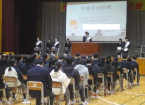 12月2日(火)午後令和8年度生徒会(銀峰会)役員選挙立会演説会が行われました。生徒会長、男女副会長、応援団長の立候補者の素晴らしさを責任者が語り、その後各候補者が目指す学校の姿や具体的な方策を堂々と述べていました。