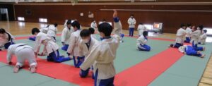 保健体育の時間に合気道の授業を実施しました。県から派遣された合気道の先生から、身のこなしや立ち技、投げ技、おさえ技を教えたいただきました。各クラス2時間ずつでしたが、武道を学ぶ心構えや柔道とは少し違った技の習得に意欲的に取り組んでいました。