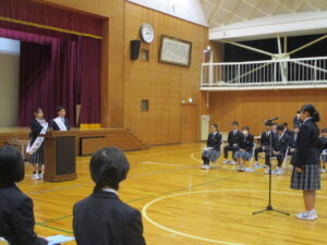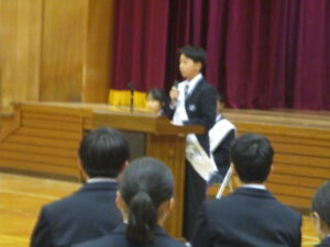 演説会では、候補者からは公約に込めた想いや決意表明が、責任者からは応援演説がありました。その後、代表生徒による質疑応答をしました。現在の生徒会リーダーである3年生からは、多くの質疑や激励の言葉がありました。先輩が築き上げた良き伝統がしっかりと引き継がれていくと実感した場面でした。