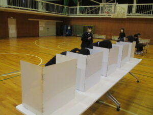 投票は、公職選挙で使っている投票箱と記載台をお借りして実施しました。生徒は責任ある一票を投じていました。