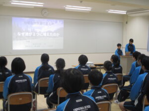 9月の中間発表会を受けて、1年生は発表内容の見直しと確認をしてきました。そして本日、2、3年生にこれまでのまとめを発表しました。