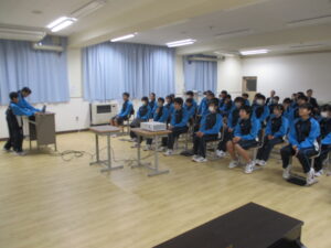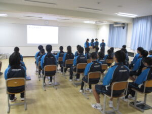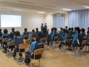 同学年内への発表とは雰囲気が異なりますが、1年生は学習した内容を伝えようと一生懸命でした。発表後、先輩からの質問にも堂々と答えていました。