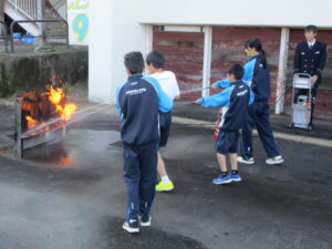 その後、1年生は消火訓練を実施しました。消火器を使い、火元へ徐々に近付いて消火することなどを学びました。