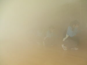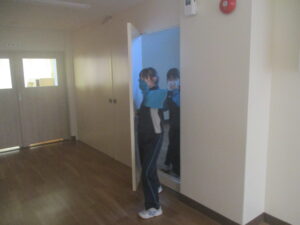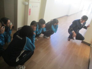 最後に、全校で防火扉の通り方や白煙内での避難の仕方を体験しました。火災時は室内の上下部分の視界が異なること、片手で壁や物を伝うことで方向感覚を失わないことなど、多くのことを学習しました。